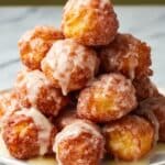 The image shows a close-up of a white plate filled with multiple small, round, golden brown fritters stacked in a pyramid shape. Each fritter is crispy with a rough texture and is covered lightly with a creamy white glaze that drips down the sides. The fritters have an uneven surface, showing a crunchy exterior and soft inside. The plate is set on a white marbled surface. Photo taken with an iphone --ar 4:5 --v 7