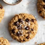A close-up photo shows a single thick oatmeal chocolate chip cookie in the center with a rough, crumbly texture and a golden brown color with visible oats. The cookie is topped with many small, dark brown chocolate chips scattered unevenly on top, and a few large flakes of white sea salt adding contrast. Surrounding the main cookie, parts of three more similarly textured oatmeal cookies are visible, all placed on a white marbled surface, highlighting the cookies' warm tones. In the top left corner, there is a small white bowl filled with coarse salt, with a rustic rough beige edge. The photo taken with an iphone --ar 4:5 --v 7