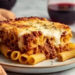Delicious Beefy Cottage Cheese Baked Ziti combines tender ziti pasta, a rich meat ragoût made with ground beef and pork, tangy tomato sauces, and a creamy cheese mixture of cottage cheese, mozzarella, and Parmesan. Baked to golden perfection, this comforting Italian-American casserole is perfect for family dinners and meal prepping.