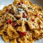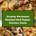 This Best Parmesan Roasted Red Pepper Chicken recipe combines tender, thinly sliced chicken breasts with bowtie pasta in a rich, creamy garlic and roasted red pepper sauce. The sauce is infused with Parmesan cheese and Italian herbs, making it a comforting and flavorful dish perfect for cozy nights in.