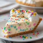 Keywords: Birthday Cake Pie, no bake pie, cream cheese dessert, graham cracker crust, rainbow sprinkles dessert, festive pie, easy dessert recipe