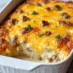 Keywords: Biscuits and gravy, breakfast casserole, sausage gravy, Southern breakfast, brunch casserole, make-ahead breakfast, cheesy breakfast casserole