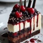 This decadent Black Forest Cheesecake combines a rich, cocoa-infused cake base with a creamy chocolate cheesecake filling, topped with a luscious cherry pie filling, whipped cream, and chocolate shavings. Perfect for chocolate lovers seeking an elegant dessert with a fruity twist.