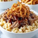 - Assemble: Spoon the creamy mac and cheese into serving bowls. Top each portion with the warm shredded brisket and drizzle additional barbecue sauce on top as desired. Garnish with crispy onion strings if using, and serve immediately for best texture and flavor.