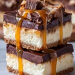 Keywords: Butterfinger cheesecake bars, caramel cheesecake bars, Butterfinger dessert, caramel cheesecake, candy bar cheesecake, easy cheesecake bars