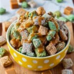 Caramel Apple Puppy Chow is a fun, festive snack that combines the crispness of Apple Cinnamon Chex cereal with sweet vanilla cake mix and vibrant green candy melts. Perfect for fall gatherings or a cozy treat, this colorful mix is sure to delight both kids and adults alike.