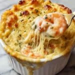 A white round ramekin filled with a golden brown baked dish with a puffed, crispy, and slightly uneven top layer. Underneath, a creamy, white sauce mixed with herbs and pieces of pink shrimp peek through where it has been scooped out. The creamy sauce is stringy and thick with melted cheese stretching upwards. The top layer shows a mix of light to darker golden brown spots, adding texture and a baked finish. The ramekin sits on a white marbled surface. Photo taken with an iphone --ar 4:5 --v 7