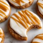 The image shows several round cookies with three visible layers: the bottom layer is a crumbly, light brown cookie base with a rough texture, the middle layer is a thick, smooth white frosting, and the top layer is a shiny caramel drizzle in wavy stripes covering the frosting. One cookie near the center has a bite taken out, revealing the soft inside of the cookie base. The cookies are placed close together on a white marbled surface. Photo taken with an iphone --ar 4:5 --v 7