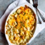 You can assemble the dish a few hours ahead, cover, and refrigerate before baking. Add a few extra minutes to the baking time if baking cold from the fridge.