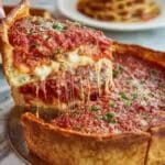 This Chicago-Style Deep Dish Pizza recipe delivers a thick, buttery crust loaded with melted mozzarella cheese, a rich homemade tomato sauce, and flavorful Italian sausage or pepperoni. Perfectly baked to golden perfection, this classic American comfort food is hearty and satisfying, ideal for dinner parties or cozy nights in.