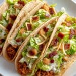 If you love crispy smash tacos and classic chicken Caesar salad, these Chicken Caesar Smash Tacos are the perfect high-protein dinner ready in under 15 minutes. Ground chicken cooks directly on the tortilla, creating a golden, crispy base topped with fresh romaine, creamy dressing, parmesan, and bacon bits for a satisfying meal.