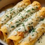 Chicken enchiladas with sour cream white sauce offer a creamy, flavorful twist on a classic Mexican dish. Tender shredded chicken is wrapped in soft flour tortillas, bathed in a rich white sauce, and topped with melted Monterey Jack cheese for a comforting meal the whole family will enjoy.