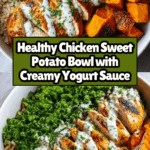 A wholesome and flavorful Chicken Sweet Potato Bowl featuring tender seared chicken, roasted sweet potatoes, and nutty brown rice, all brought together with a creamy garlic tahini yogurt sauce. Perfect for a balanced meal that’s both nutritious and delicious.
