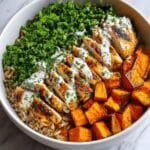 - Assemble the Bowl: Layer cooked brown rice at the bottom of your serving bowl. Top with the roasted sweet potatoes and seared chicken pieces. Drizzle the creamy garlic tahini yogurt sauce over everything. Garnish with fresh parsley if desired, and serve warm.