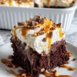 This decadent chocolate cake recipe combines rich devil’s food cake with a luscious caramel and sweetened condensed milk soak. Topped with cool whip and crunchy Heath bars, it’s a delightful treat perfect for any occasion or family gathering.