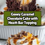 This decadent chocolate cake recipe combines rich devil’s food cake with a luscious caramel and sweetened condensed milk soak. Topped with cool whip and crunchy Heath bars, it’s a delightful treat perfect for any occasion or family gathering.