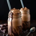 Two glass jars are filled with layers of thick, creamy chocolate mousse mixed with dark chocolate syrup swirled inside. The mousse is light brown with smooth, velvety texture, and the dark chocolate syrup creates irregular streaks wrapping around the mousse in each jar. Each jar has a clear glass straw inserted, with some chocolate syrup drizzled on the rim of the nearer jar. The jars sit on a dark wooden surface, scattered with small chocolate chips and a few broken pieces of dark chocolate. A silver spoon lies to the right of the jars. photo taken with an iphone --ar 4:5 --v 7