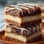 Two square dessert bars are stacked on a wooden plate, each bar showing three layers. The bottom layer is a crispy, crumbly brown crust. The middle layer is thick, creamy, and light beige, looking smooth and soft. The top layer is a dark brown caramelized, sticky topping with a slightly rough texture. White icing is drizzled in thin lines across the top and sides of the bars. The background is blurred with a white marbled texture underneath the wooden plate. photo taken with an iphone --ar 4:5 --v 7