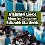 Cookie Monster Cinnamon Rolls are a fun and colorful twist on classic cinnamon rolls, featuring a vibrant blue dough infused with crushed chocolate sandwich cookies and mini chocolate chips. These soft, fluffy rolls are layered with a cinnamon-sugar-cookie filling and topped with a creamy, smooth cream cheese icing, garnished with extra crushed cookies and chocolate chips for added texture and flavor. Perfect for breakfast, brunch, or a special treat, these rolls combine visual appeal with delightful taste.