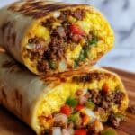 - Assemble Burritos: Lay out each tortilla and evenly distribute the fillings: ¼ cup shredded cheddar, ¼ cup shredded Monterey Jack, ½ cup meat mixture, ¼ cup scrambled eggs, and ¾ cup potato-vegetable mixture.