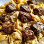 Keywords: garlic steak tortellini, creamy garlic sauce, steak pasta recipe, easy dinner, comfort food, parmesan cream sauce, seared steak pasta