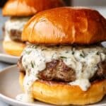These Creamy Garlic Burgers are juicy, flavorful, and topped with an easy-to-make creamy garlic sauce that elevates this classic comfort food. Using 80/20 ground beef for the perfect balance of juiciness and flavor, these burgers are seared to perfection on the stovetop and paired with a tangy, creamy sauce made with mayonnaise, sour cream, garlic, lemon juice, and fresh dill. Toasted brioche buns provide a soft, buttery base, making every bite deliciously satisfying and ideal for a quick and impressive homemade burger experience.