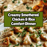 Creamy Smothered Chicken & Rice is a comforting and flavorful dish featuring juicy, tender chicken thighs or breasts cooked in a rich, savory cream sauce made with chicken broth, heavy cream, and a touch of Worcestershire sauce. Served over fluffy rice and garnished with fresh parsley, this meal is perfect for cozy family dinners and adaptable for various dietary preferences.