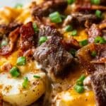 This Loaded Steak and Potato Bake is a comforting, hearty dish perfect for any day of the week. Tender steak, creamy potatoes, crispy bacon, and melted cheddar combine to create a rich and satisfying meal that the whole family will love.