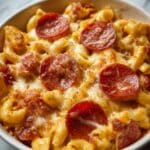 5. Add Cheese and Remaining Pepperoni: Once the pasta is fully cooked, sprinkle the shredded mozzarella and cheddar cheese evenly on top. Add the remaining pepperoni slices on the cheese layer.