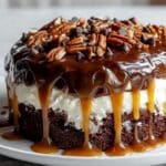 Indulge in this Decadent Chocolate Turtle Cake, a luscious dessert featuring moist chocolate cake layers enveloped in creamy cocoa frosting, drizzled with rich caramel sauce, and sprinkled with crunchy chopped pecans. Perfect for chocolate and caramel lovers looking for an irresistible treat.