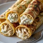 The image shows four rolled crepes placed closely together on a white plate, each crepe having a golden-brown, slightly crispy outer layer with some darker toasted spots and sprinkled green herbs on top. Inside each crepe, there is a visible filling of shredded light brown chicken mixed with creamy white sauce speckled with green herbs, giving a soft and smooth texture. A silver fork rests on the edge of the plate, which is set on a natural wooden surface. The focus is close-up, capturing the texture and color contrast between the crispy crepe and the creamy chicken filling. photo taken with an iphone --ar 4:5 --v 7