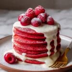 Delight your Valentine’s brunch with these fluffy, moist Red Velvet Pancakes topped with a creamy, sweet cream cheese glaze. Made with rich cocoa, vibrant red coloring, and classic buttermilk, these pancakes are a perfect blend of flavor and festive color that will impress your loved one.