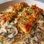 The image shows a close-up of a rice dish with three pieces of golden-brown, crispy chicken on top. The rice is light in color and looks soft with some visible grains. A creamy mushroom sauce with sliced mushrooms covers parts of the rice and chicken, adding a smooth texture. The chicken pieces are sprinkled with green herbs, giving a fresh look. Everything is on a white plate placed on a white marbled surface. Photo taken with an iphone --ar 4:5 --v 7