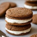These Gingerbread Sandwich Cookies are a festive holiday treat featuring spiced gingerbread cookies sandwiched together with a creamy vanilla frosting. The perfectly balanced spices of ginger, cinnamon, nutmeg, and cloves combine with rich molasses and brown sugar for a soft yet slightly crisp cookie. Paired with a smooth, buttery frosting, these sandwich cookies are ideal for holiday gatherings or gifting.