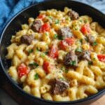 Heavenly Steak & Pepper Jack Queso Mac is a comforting and flavorful dish perfect for cozy nights. This creamy mac and cheese features tender diced beef steak, sautéed bell peppers, and onions blended into a smooth pepper jack cheese sauce served over classic elbow macaroni. The combination of spicy cheese, savory steak, and vibrant vegetables creates a melt-in-your-mouth experience that is both hearty and satisfying.