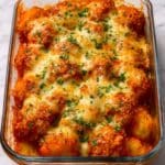 The image shows a rectangular clear glass baking dish filled with multiple round baked potato balls covered in melted cheese and tomato sauce. The top layer of cheese is golden brown with some bubbly spots, decorated with tiny chopped green herbs scattered evenly for a fresh look. The potato balls beneath have a slightly crispy orange-brown texture visible under the cheese. The dish sits on a white marbled surface. photo taken with an iphone --ar 4:5 --v 7