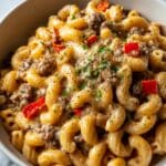 This High-Protein Creamy Philly Cheesesteak Mac & Cheese combines the satisfying flavors of a classic cheesesteak with the comforting creaminess of mac and cheese. Packed with lean ground beef and colorful peppers, it’s a delicious, hearty twist on a favorite comfort dish.