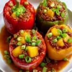 This Homemade Teriyaki Pineapple Chicken Stuffed Peppers recipe combines tender chicken, sweet pineapple, and savory teriyaki flavors all packed inside colorful bell peppers. It’s a delicious Asian-inspired dinner option that’s both hearty and bursting with vibrant taste. The dish is topped with melted cheese for a satisfying finish and garnished with fresh green onions for added brightness.