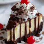 - Step 4: When ready to serve, drizzle the warmed hot fudge sauce evenly over the cheesecake. Pipe whipped cream on top, and garnish with shaved chocolate and maraschino cherries. Slice and enjoy your rich, layered dessert!