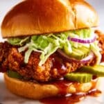 - Assemble: Place the fried chicken on the bottom bun, drizzle generously with the hot honey sauce, and top with sliced pickles and fresh lettuce leaves.
