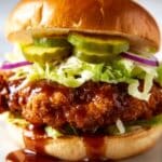 Store leftover fried chicken separately in an airtight container in the refrigerator for up to 3 days. Keep buns and sauce separate to prevent sogginess. Reheat chicken in the oven or air fryer to maintain crispiness before assembling the sandwich again.