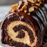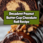 This Irresistible Peanut Butter Cup Chocolate Roll features a light and fluffy chocolate sponge cake rolled with a creamy peanut butter filling loaded with chopped peanut butter cups, and topped with a rich chocolate ganache. Perfect for holiday celebrations or decadent dessert cravings, it combines classic flavors in an elegant rolled cake form.
