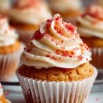 A close-up of a single golden brown cupcake in a white paper liner with a swirl of creamy white frosting on top, covered with small red sugar crystals scattered over the frosting. The cupcake texture looks moist and soft, with other similar cupcakes blurred in the background. The scene is set on a white marbled surface. photo taken with an iphone --ar 4:5 --v 7