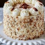 - Frost and Layer: Frost each layer, sprinkling reserved toasted pecan pieces on top before adding the next layer. Add final layer and frost the top and sides of the cake.