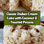 This Southern-style Italian Cream Cake features a rich, moist cake filled with toasted pecans and sweetened flaked coconut, layered with a luscious cream cheese frosting. Perfect for celebrations, this cake offers a delightful blend of nutty and creamy flavors with a tender crumb, making it a show-stopper dessert for birthdays, holidays, or any special occasion.