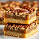 Store leftover pecan bars in an airtight container at room temperature for up to 3 days. For longer storage, keep them refrigerated for up to a week. To reheat, warm individually in the microwave for 10-15 seconds or enjoy them cold for a chewy texture.