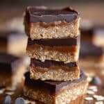 A stack of four square treats with two visible layers each; the bottom layer is a thick, crumbly, light brown base with visible oat flakes giving it a rough texture, while the top layer is a smooth, dark chocolate coating with a shiny finish and slightly uneven edges. The stack is placed on a wooden surface, scattered with a few whole oats and dark chocolate chips around it. The background is softly blurred, focusing attention on the detailed layers of the treats. photo taken with an iphone --ar 4:5 --v 7