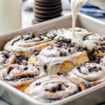 - Glaze and serve: Let the cinnamon rolls cool for 10-20 minutes, then drizzle the glaze evenly over the rolls. Garnish with additional chopped Oreos if desired and serve warm.