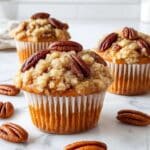 These Pecan Pie Brown Sugar Muffins combine the classic flavors of pecan pie in a soft, moist muffin form. Featuring a tender crumb with warm cinnamon and brown sugar, each muffin is topped with a buttery pecan crumble and a pecan half, making them a perfect breakfast treat or afternoon snack that’s as comforting as it is delicious.