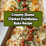 Keywords: queso chicken enchiladas, baked enchiladas, Tex-Mex recipe, cheesy chicken enchiladas, weeknight dinner, easy enchiladas bake, creamy queso sauce